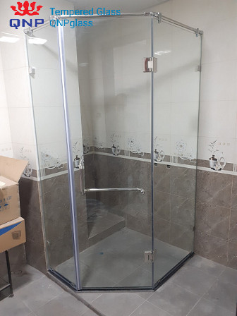 Phòng tắm kính vát góc hay còn gọi là vách tắm kính vát góc 135 độ. Đây là loại vách tắm kính đứng không khung sử dụng bản lề 135 độ, kính cường lực 10mm và các phụ kiện inox 304 đi kèm. Dạng vách tắm kính này thường được dùng cho những phòng tắm có diện tích nhỏ hẹp, có hhai hoặc một mặt tiếp giáp với tường.